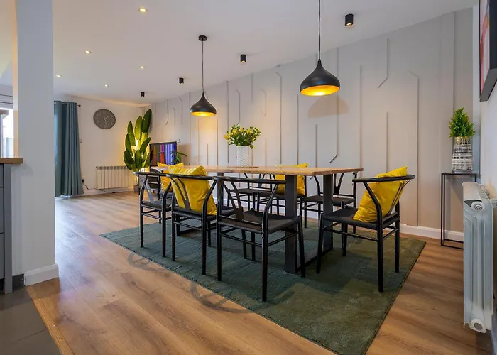 Eine komplette Küche sowie ein Essbereich im Freien stehen Selbstversorgern zur Verfügung. Sie können auch einen Wasserkocher, einen Kühlschrank und Küchenutensilien nutzen, um Ihre eigene Mahlzeit zuzubereiten. Verbringen Sie einen schönen Abend im Restaurant The Crown, das ca. 1 km von hier entfernt liegt. Die Villa Private Luxe Bournemouth 5Br-7 Beds-3 Bath-Garden-Parking ist mit dem Auto in 15 Minuten vom Flughafen Bournemouth aus zu erreichen.
